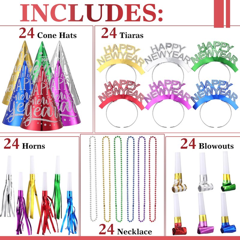 - 24 Guests New Year Party Kit: our 2025 new year's party accessories come complete with 24 cone hats, 24 glitter tiaras, 24 beaded necklaces, 24 tassel squawkers, and 24 curled squawkers, this versatile package is designed to serve 24 guests