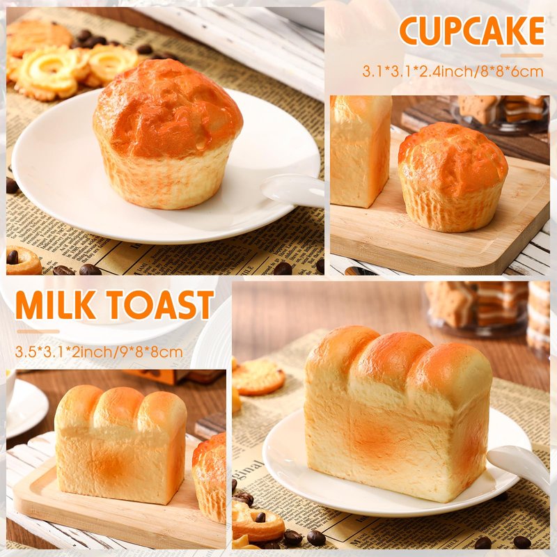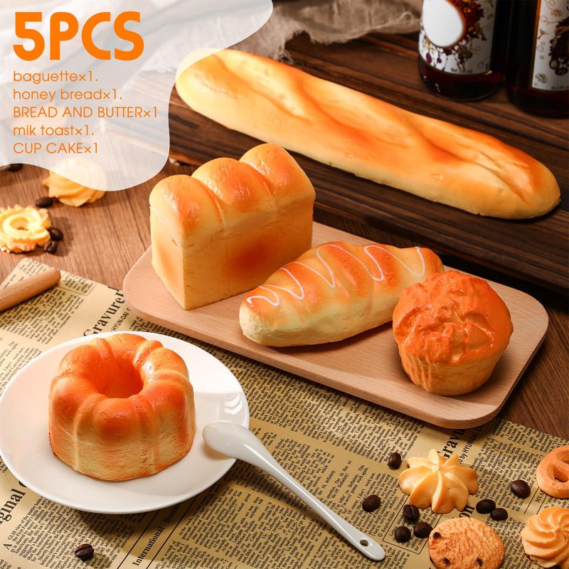 - What's Included: this bread set includes a French bread, a honey concave bread, a butter bread, a milk toast, a small cake; Each piece is meticulously crafted from quality PU material; Each toy is filled with a special semi solid content that won't leak or break easily, ensuring safe, long lasting usage