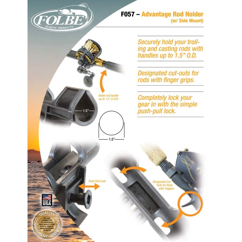 Fishing with our quick release fishing rod holder means that you can handle any striker or serious rod take down. Great for trolling for redfish or anchor fishing at the hogline, it's redi set design makes it simple and easy to use. From light biting pike to that heavy hitting catfish that has your rod buried, just pull straight up and you're out in the fish fighting position. Only the best marine grade materials makes this one of the strongest rod holders on the market. We made this rod holder to last many reliable years and used non-corrosive materials with stainless hardware for fresh or saltwater use. Depending on space, as well as where and how you mount the rod holder, it can be adjusted horizontally 360° in 12 separate steps at 30° each. Vertically, the rod holder can be adjusted up to 180° in 8 separate intervals at 22.5° each. You can also attain many other angles with the adjustment discs. Clam-shell design holds your fishing rod securely and releases it extremely quickly and smoothly. Advantage Rod Holder will hold rods with handles up to 1½” diameter. Cutouts in the holder accepts rods with finger grips. Positively locks in your gear when needed, quickly and easily with our push-pull locking knob. Positive locking bases mean no movement whatsoever. Our bases accept many other manufacturers' gear as well. Made of non-corrosive materials for years of reliable use. Made of fiber-reinforced materials, so it's virtually impossible to break. Virtually eliminates any struggle to release your rod from the holder. Built around bait cast reels – when using a spin cast design we recommend locking it. Mount Dimensions: 4” x 2” x 2” Bolting dimensions: 1-5/16” x 3-3/16”