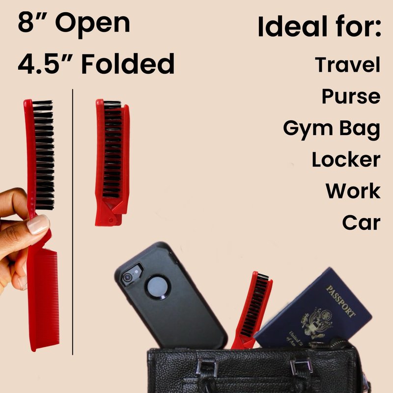 Folding Compact Travel Pocket HAIR BRUSH/COMB Travel Camping School Gym Locker Work Car Purse Dorm 2pc Set Red & White Color