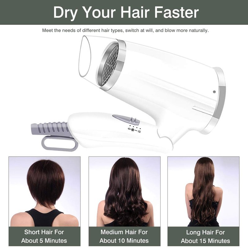 - đăCompact Hair Dryer with Folding Handleă: with ergonomic folding handle, this compact hair dryer is ready to join you on your journey; 8.7x6.5ââ/22x16.5cm of full size, 4x6.5ââ/10x16.5cm of folded size, perfect for storage in small spaces