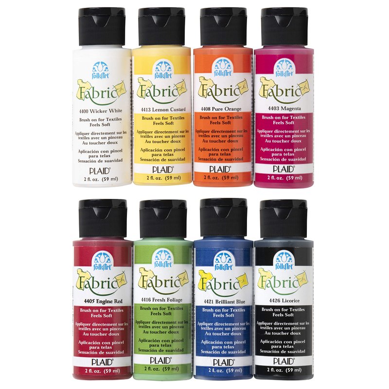 - CONVENIENT SIZE - This fabric acrylic paint set includes 8 - 2 oz bottles of fabric craft paint. The colors in this paint set include: FolkArt Fabric Wicker White, Licorice, Engine Red, Lemon Custard, Fresh Foliage, Magenta, Brilliant Blue, and Pure Orange