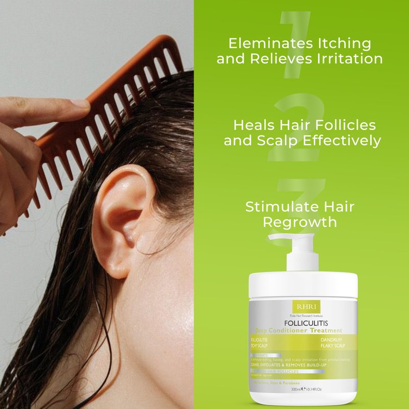- Advanced Folliculitis Conditioner: This conditioner targets folliculitis, soothing and calming an irritated, itchy scalp. It helps reduce redness and inflammation while offering effective treatment for scalp psoriasis and seborrheic dermatitis.