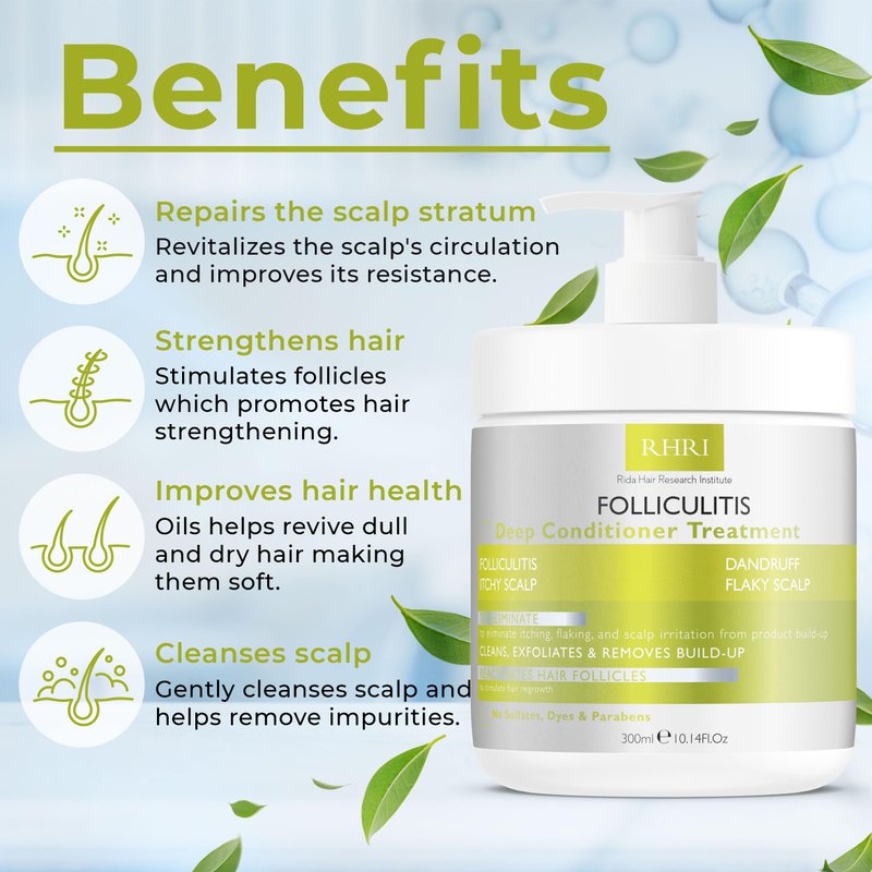 Experience the revolution in scalp care with our groundbreaking folliculitis treatment deep conditioner from the renowned Rida Hair Research Institute. Meticulously formulated by our team of esteemed scientists, this extraordinary product transcends traditional hair care, offering a multifaceted solution to a spectrum of scalp issues. Our deep conditioner boasts an unparalleled blend of advanced science, proprietary formulations, and potent herbal extracts. This powerful concoction not only combats folliculitis but also acts as a formidable ally against dandruff, seborrheic dermatitis, and scalp psoriasis. Each application delivers a concentrated dose of relief, addressing itching, acne, flaking, redness, and discomfort with remarkable efficacy. What sets our formula apart is its natural derivation. Infused with gentle yet potent herbal extracts, our deep conditioner provides potent relief without the risk of harsh side effects. Crafted with care, it promotes scalp health holistically, ensuring your well-being while effectively combating scalp conditions. Ease of use is paramount in our design. Packaged for convenience and leak-proof assurance, our deep conditioner makes application a breeze. Simply massage into the scalp for 3-5 minutes to maximize absorption, rinse thoroughly, and repeat as needed. Bid farewell to folliculitis, dandruff, and scalp discomfort, and welcome transformative results with open arms. This isn't just another hair care product; it's a targeted scalp treatment tailored to meet your diverse needs. Suitable for both men and women, our deep conditioner stands as a testament to our unwavering dedication to innovation and understanding consumer needs. Join us in the journey to healthier, happier scalps, one application at a time.