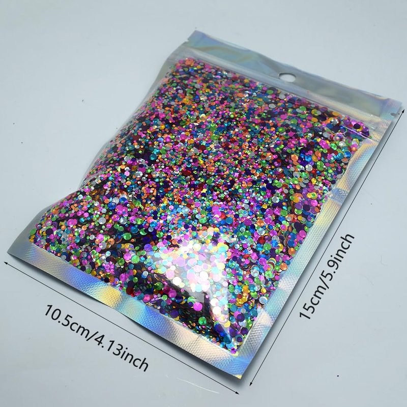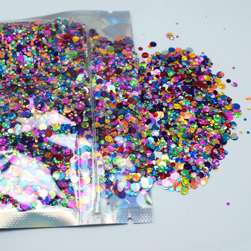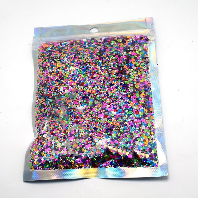 Specifications: 1. Dots Shape mixed glitter powder, 2. Non-toxic Material: Polyester 3. Heat and Solvent Resistant 4. Colors: different colors mixed Multipurpose Dots Chunk Glitter 【Decorate and Enlighten Your Life】 This chunky glitter can be used to add extra sparkle to your nails, cosmetic body art, hair, makeup, beards and temporary tattoo, use it to add some glitz and glamour to your party, creating unique and eye-catching visual effects. 【For DIY Art Crafts】 To mix with resin to make fantastic resin jewelry, resin ashtray, resin key-chains, resin boxes, geode coasters, Halloween decors, Christmas ornaments, home decors etc. To mix with soap, wax, slime, acrylic paint, polymer clay etc, to make soaps, candles, glitter slime, glitter tumblers, acrylic paintings, greeting cards, creative gifts and so on. 【For Beauty Makeup】 - Directly apply it to nail, face, body, hair, eyeshadow - Mix with cosmetics, nail polish, hair gel etc, to create charming look, nail art, and hairstyle. -Ideal for DIY fabulous eyeshadow, lip gloss, highlighter, brow powder etc.