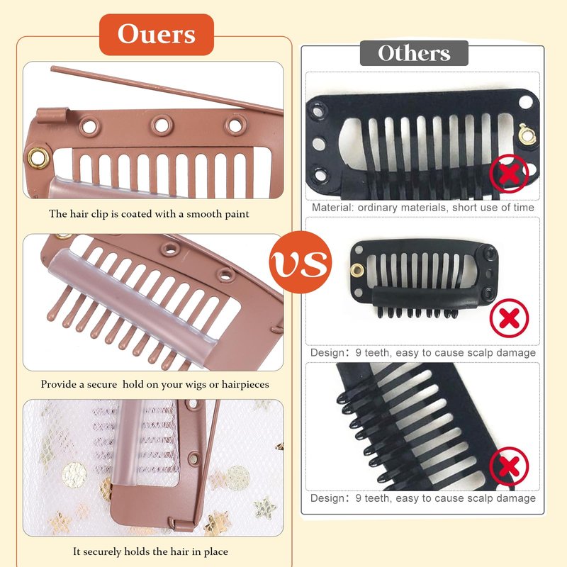 The wig clips are must-have accessories for anyone wearing wigs or hair extensions. With its sturdy design, it securely holds the hair in place, preventing any slippage. The hair clip is coated with a smooth and durable paint, ensuring that it remains rust- and has a longer lifespan.