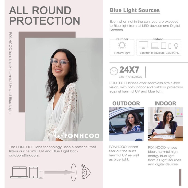 - 【PROTECT YOUR EYES】- Laptops, tablets and smartphones have become more and more integrated into our daily lives. Even most of us spend at least eight hours a day in front of a screen at work. Prolonged and repeated exposure to blue light can have a number of ill-effects on our bodies,from headaches and eye strain to straight-up insomnia.It's time to prepare a pair of FONHCOO blue light glasses to protect your eyes from blue light.
