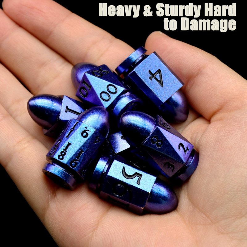 - METAL DICE SET: The bullet d&d dice set are made of solid metal and full set weighs approximately 140 g, providing a nice and heavy feeling when rolled. To protect the table surface, it is recommended to use trays and mats