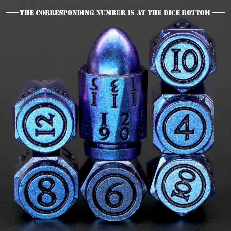 - COOL BULLET DICE: The bullet design of these dice will make them stand out on the gaming table, immersing players into the world of dnd dice games. This set includes 7 pcs, each marked with a number on the bottom, making them easy to distinguish quickly
