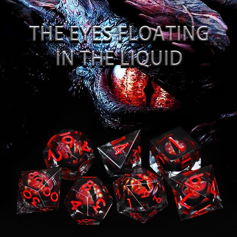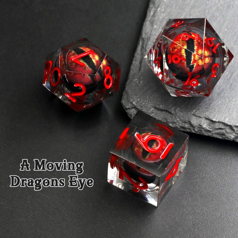- DRAGON EYE DICE: A lifelike dragon eye inside the dice, floating in a liquid, always looks strait up no matter how the dice roll. With the cool and unique design, they are an absolute showstopper on any gaming table