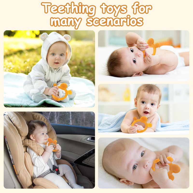 - 【Ergonomic and Attractive Design】: Our teether has perfect size and feature which make it can be easily for babies to grasp and maintain their grip .The size and shape of the baby toys safely bite from any angle without vomiting. The soft and bendable silicone material can avoid damaging your baby's gums. These teething toys are uniquely designed for babies 0-6 months and 6-12 months,at least one of them will be his or her favorite.