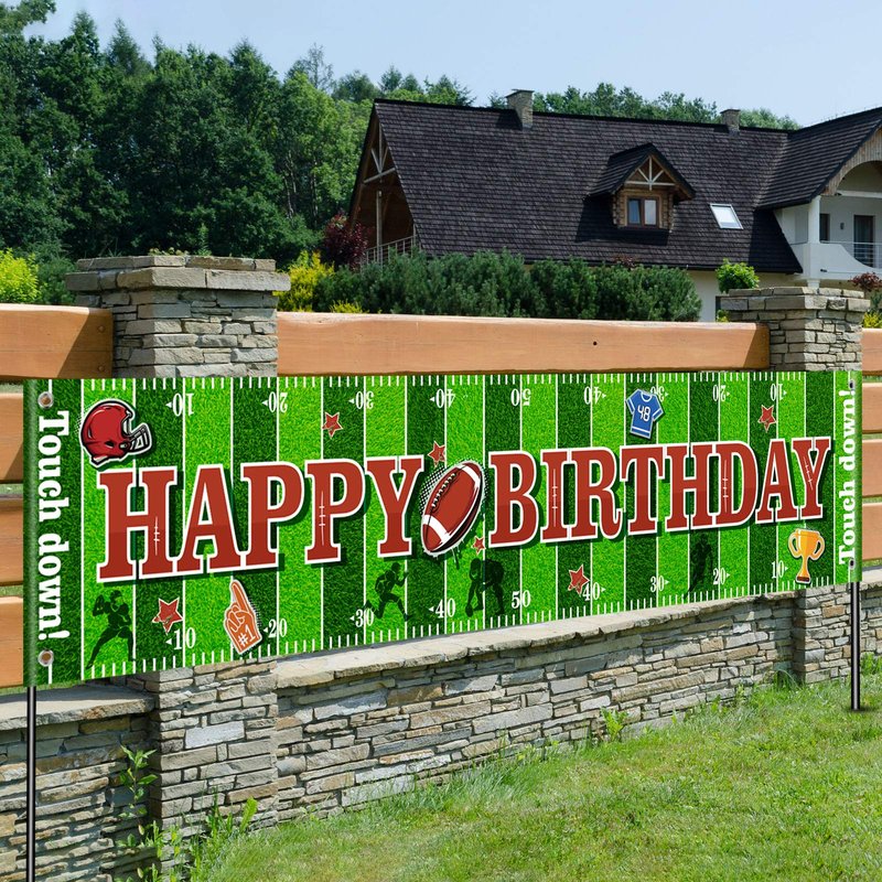 Football happy birthday banner football themed party decorations sunday game day sports fan supplies birthday party favorsEasy to assemble:Use a rope to go through the holes in the four corners of the banner cloth to hang it anywhere you want to decorate. Feature:Vibrant printing, seamless, durable, lightweight, easy to carry and non-fading.Wide application: Can be applied as a photo background, wall decor, room tapestry, curtain, birthday cake table banner, photo studio photography for football theme party, birthday party, festivals, etc..Specification:Material: thick polyester fabricsSize: Banner: 70.8 x 15.7 inches/ 180 x 40 cmString: 13.12 feet/ 4 meterPackage includes:1 x Banner1 x White stringNote:The rope included in the package has a risk of entanglement, please keep away from children.Please allow slight deviation due to manual measurement.