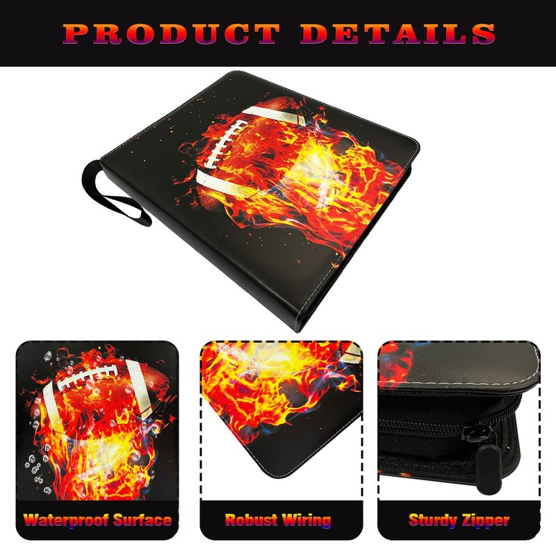 Football Cards Binder Each page has 4 pockets that hold cards on both sides and includes 50 high-quality removable sleeves that can hold up to 400 cards for trading card games. The three-loop design allows you to add or remove sleeves at will for all your collecting needs.The trading card binder is made of thick PU leather, Water or raindrops won’t seep through. the transparent card sleeves' main material is clear polypropylene, durable quality, Acid Free, waterproof, super sturdy that won't get cards to bend up, protect your card from fading and stain.The waterproof trading card sleeves keep better protection adopt reinforced heat-sealed seams technology. The quality zipper seals the binder so that the inner pages or cards do not fall. The extra wristband design makes it easy for both kids and adults to carry around.