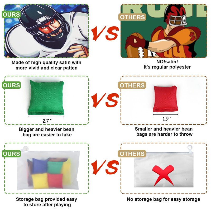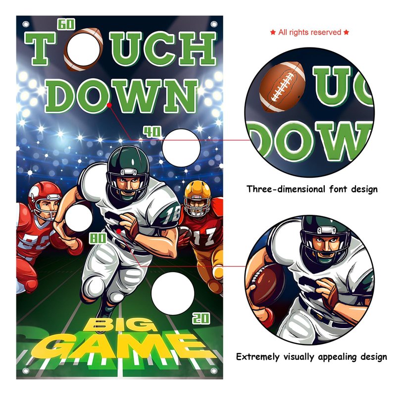 - ðVivid Design Football Games: Our meticulously designed football toss game is truly unique. The football banner of bean bag toss games features energetic football players on the field, along with footballs and bold phrases like "touch down" and "big game". Overall design exudes the vibrant and passionate atmosphere of a football match, providing your children with a burst of spirit and energy, allowing them to experience the spirit of football. A ideal football nfl game and superbowl games.