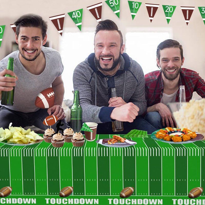 98PCS football themed party decorations including 24pcs 9" dinner plates, 24pcs 7" dessert plates, 24pcs 6.5" napkins(contains 2 patterns), 24pcs 9oz cups(contains 2 patterns), 1 piece triangle pre-strung football banner,No DIY and 1 piece 54" x 108" football touchdown tablecloth.