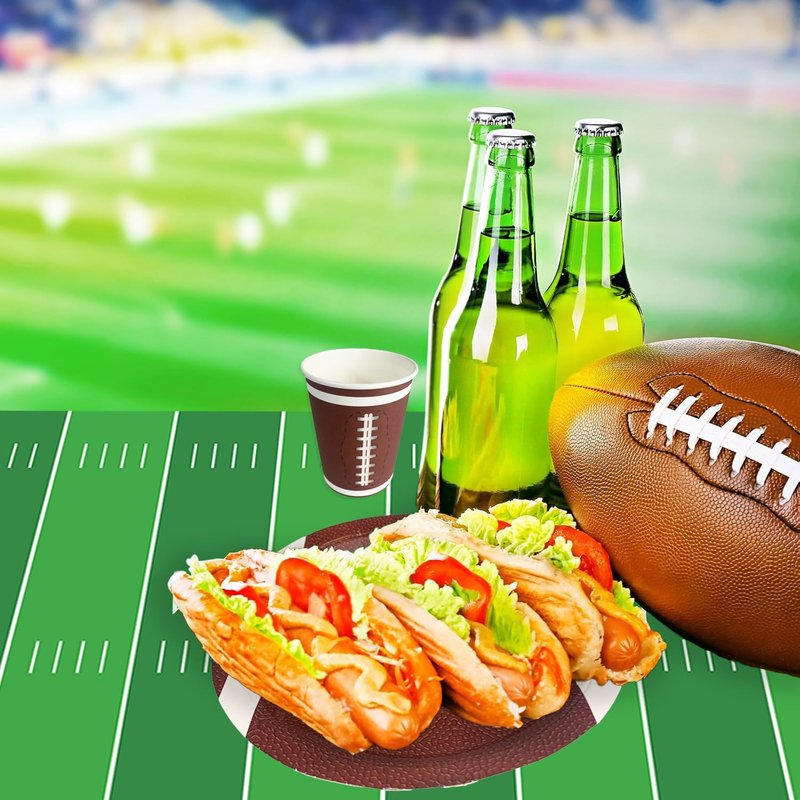 - Football Party Decorations Set - The football party supplies include 24pcs 9" dinner plates, 24pcs 7" dessert plates, 24pcs 6.5" napkins(contains 2 patterns), 24pcs 9oz cups(contains 2 patterns), 1 piece pre-strung football banner,No DIY and 1 piece 54" x 108" football touchdown tablecloth. Which will help you enjoy a unforgettable football birthday party with your friends!