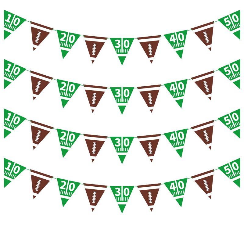 - PACKAGE INCLUDING: 4 sets of both side printed triangle foodball banners. Each string is 8.9 feet long with 9 pieces flags. Each football flag panel size 7.88”x 8.86” (L x H).