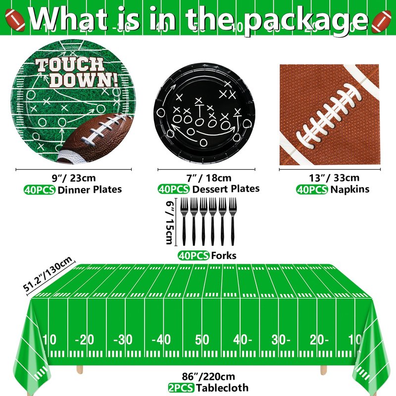 - 【Football Game Day Party Supplies】Package includes 40 x 9’’ touch down plates, 40 x 7’’ football formation tactics plates, 40 x football napkins, 40 x forks, 2 x football field tablecloths.