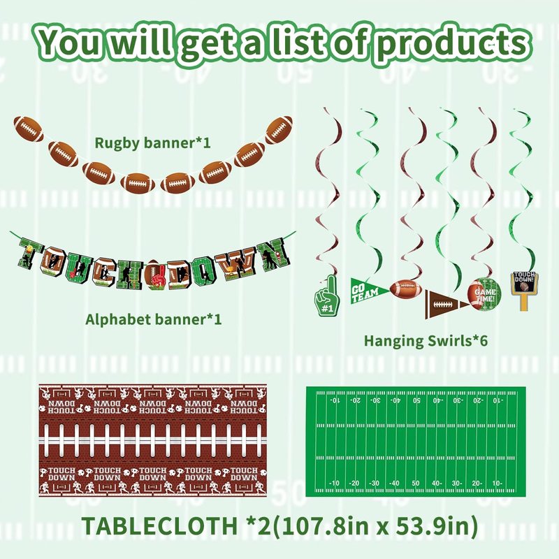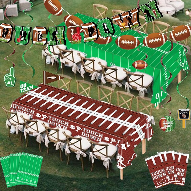 - Football Party Decorations Include: 2 x Different Pattern Tablecloths, 2 x Pull-the-Flag Banners, 6 x Hanging Swirls. Perfect for football parties, baseball decorations, tailgates, and birthday celebrations