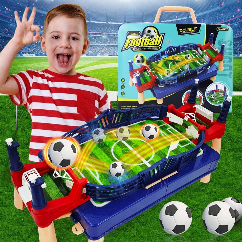 - Accessories: The size of this table football game is: 22" x10" x8" / 55 x 26 x 21 cm; The set contains 1 football fields, 2 balls of soccers, 4 control handles, 2 goal nets, and 2 fence used to secure the football fields, it's also very easy to instal