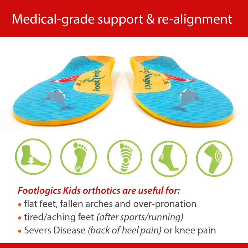 - AMAZING PAIN RELIEF BENEFITS - Developed by Australian podiatrists, Footlogics children’s insoles provide relief from growing pains, Sever’s Disease, fallen arches, flat feet, over-pronation, and other foot complaints.