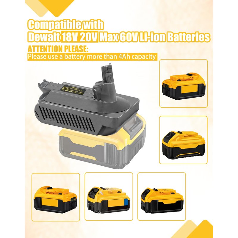 - đź’›[Adapter for Dewalt to V10] V10 Adapter can convert for Dewalt 18V/20V Max/60V Lithium ion battery to replace for dyson v10 battery, and then work with v10 series vacuum cleaners, but not fit for dyson v10 slim cordless stick vacuum cleaners.