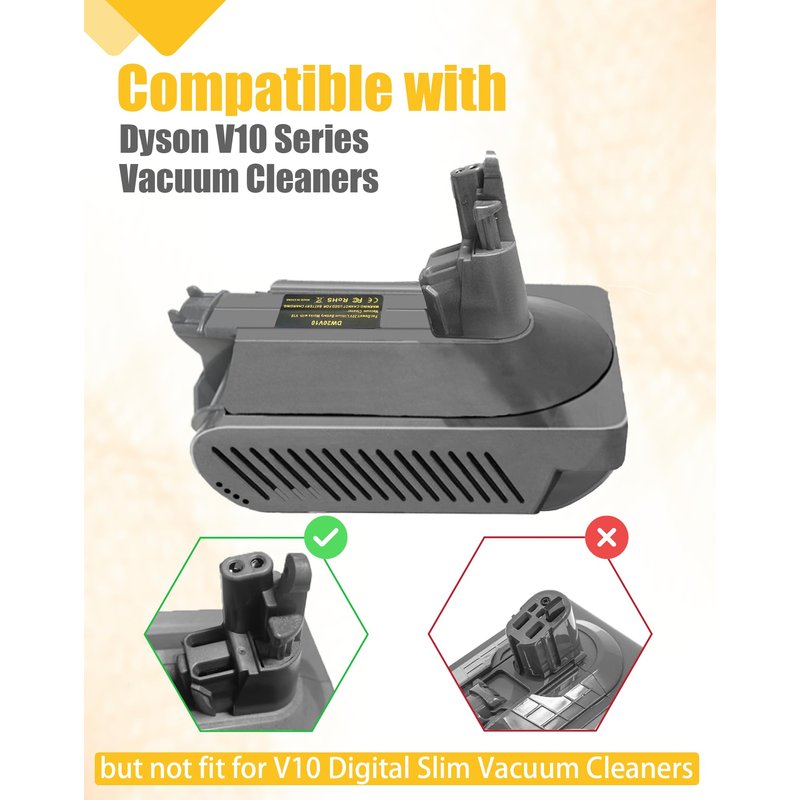 - 💛[Work for Dyson V10 Series Vacuum Cleaners] JJXNDO V10 vacuum battery adapter is used for dyson v10 series cordless stick vacuum cleaners, such as V10 Cyclone, V10 Animal, V10 Absolute, V10 Fluffy, V10 Motorhead, V10 Allergy, V10 Total Clean vacuum cleaners. ❌BUT CANNOT USED FOR DYSON V10 Slim, Digital Slim Fluffy Extra, Digital Slim Fluffy Pro, V10 Digital Slim, V10 Digital Slim Fluffy Extra VACUUM CLEANERS.❌NOT FIT FOR SV10 V8.