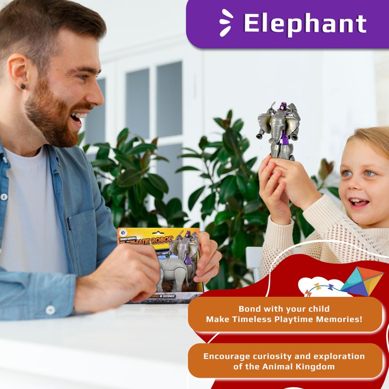 - TRANSFORMING ROBOT ELEPHANT – Watch your child’s eyes widen in amazement as they discover the hidden secrets this Elephant animal toy holds. By moving its pieces around, it transforms into a fully articulate and powerful robot toy.