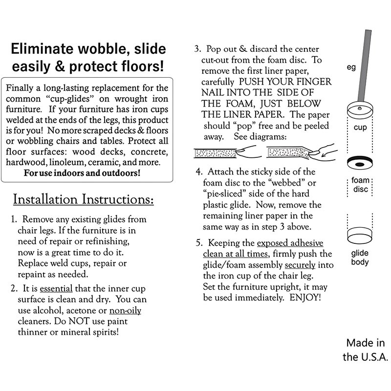 Forever Glides are revolutionary self-leveling replacement feet for wrought iron furniture. The replacement feet replace those missing plastic pop-in furniture inserts with glides that stay in place. Missing table and chair feet inserts can cause damage and scrapes to your surface. Forever Glides protects all your floor surfaces! Replace your old-fashioned pressure fit cup inserts with new high-grade Delrin material glides made for durability and last up to 10 times longer than conventional glides. Forever Glides are made in the USA.