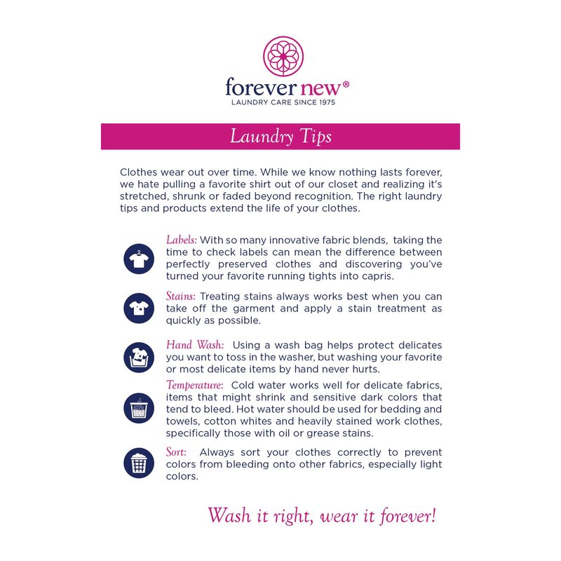 - GENTLE CLEAN – Forever New detergent has a base of gentle ingredients, creating a highly effective formula that deep cleans and extends the life of your garments.