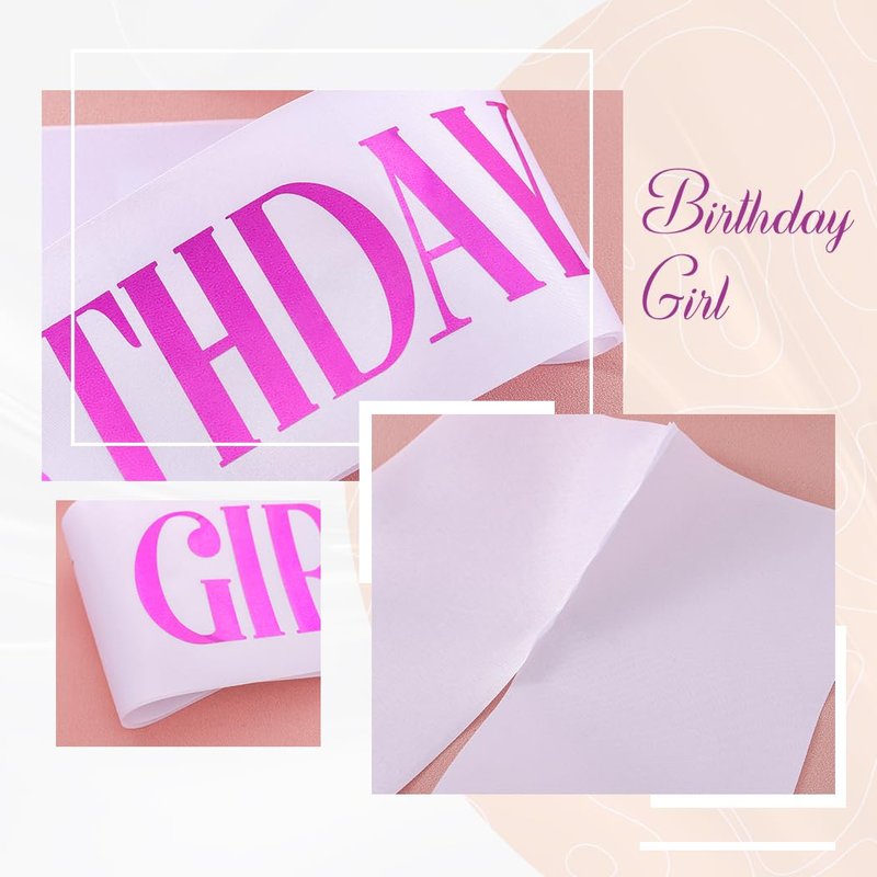 1 crystal tiara crown, 1 “Birthday Girl” sash and 2 paper clips.