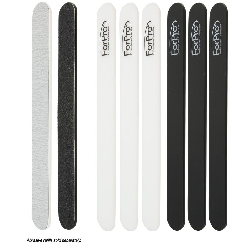 ForPro Super Duper Replaceable File System Handles are comfortable to use, high quality, and disposable. The double-sided handle design allows these manicure nail file handles to be applied on one or both sides of the handle. The double-sided handle design allows these manicure nail file handles to be applied on one or both sides of the handle. These nail file handles work well with nail files as it offers easy and comfortable back and forth filing of nails. Recommended to use with ForPro O-Files Replaceable File System Refills or O-Files Replaceable File System Quick Shine Buffer Refills. Please note: Refills sold separately. ForPro Super Duper Replaceable File System Handles come in a pack of 6 and contain 3 black handles and 3 white handles. Each replaceable file handle measures 7” L x .75” W. ForPro Professional Collection features the highest quality, best value, and largest selection for professionals and consumers. All products include 100% unconditional guarantee.