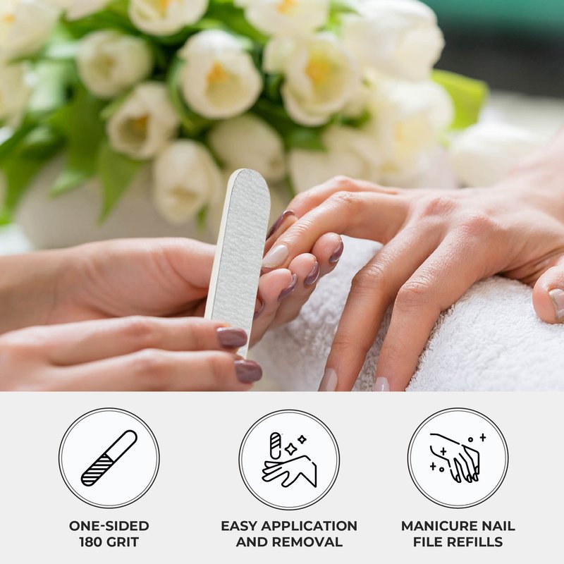 - 180 Grit Nail Files: These nail files are great for filing natural & artificial nails as it removes ridges & tough stains. They can also be used to shorten, polish & shape the free edges on natural or uneven nails.