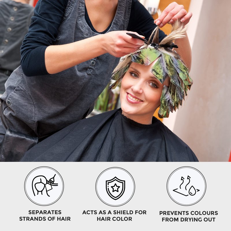 - Hair Foils for Color Application: These foils sheets feature an embossed design that helps hair to better grip the foil during hair color application and highlighting services. The durable sheets bend to any shape without compromising the integrity of the service.