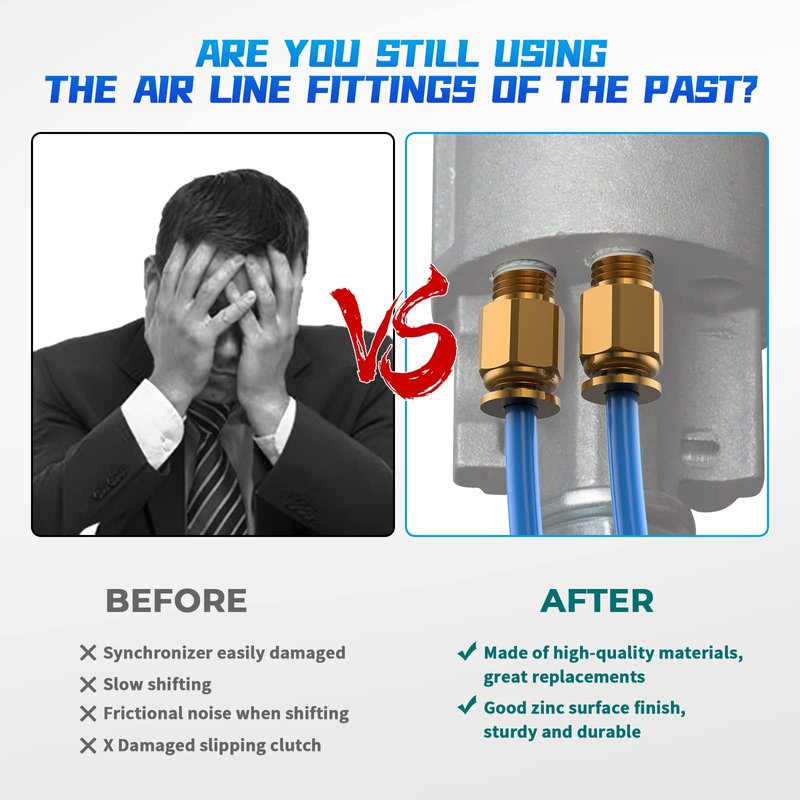 - 🚕【New Push-In Fittings】: These new style push-in air fittings will allow you to slide the line into the fitting without any possibility of over-tightening like the old style fittings. Over tightening the air fitting will collapse the line and cause restricted airflow which will cause slow shifts and wear on the synchronizer and gears during low to high speed and high to low speed shifts.