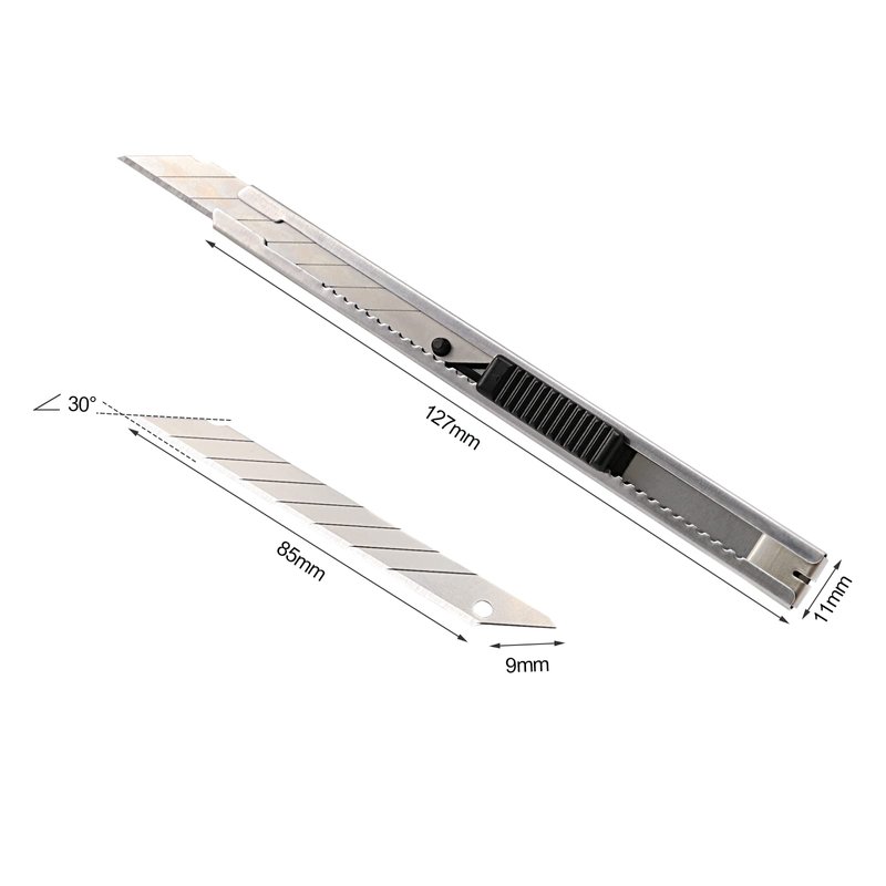 - Retractable utility knife set include 3pcs cutter knife and extra 30pcs 30 degree carbon steel 9mm replacement blacds.