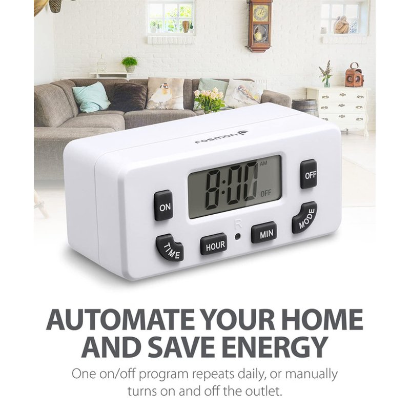 - [AUTOMATE YOUR OUTLET] Simply plug in the Fosmon 24-hour outlet timer and let the timer control your device to follow your daily 24-hour programmable schedule. You are also able to manually turn the outlet on and off using the MODE button. The timer is great for holiday/Christmas decorations, patio lights, heaters, lamps, fans, and aquariums.