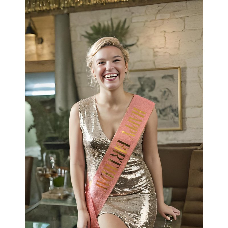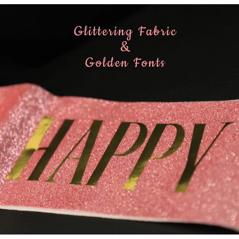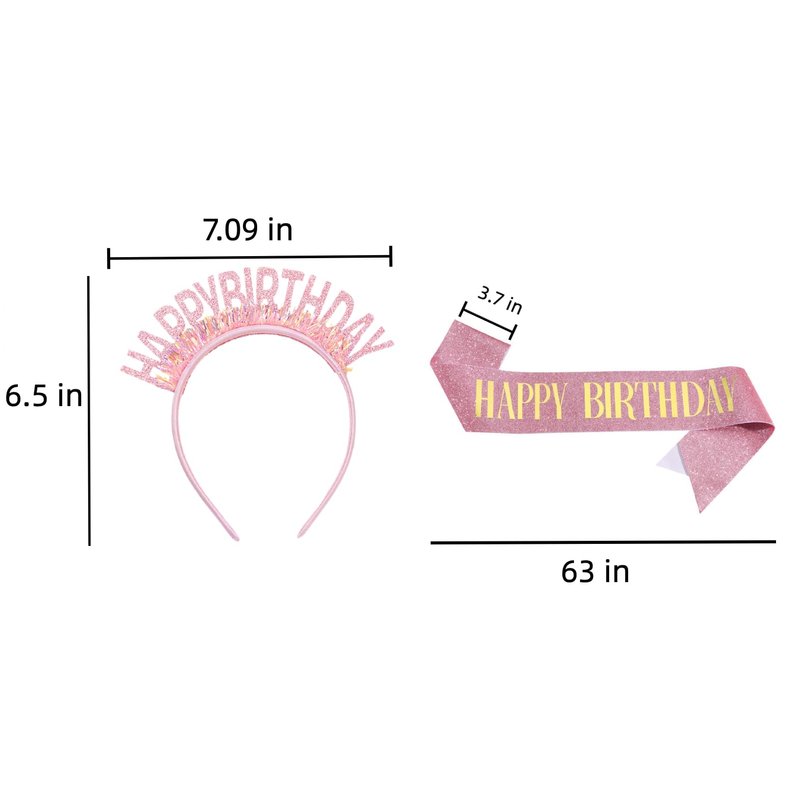 - Birthday Chic Design - The pink birthday sash features glossy sheen and gold PET lettering of “Happy Birthday” for a trendy look, and the birthday crown's glittering, three-dimensional “Happy Birthday” letters with gold thread create a festive birthday vibe.
