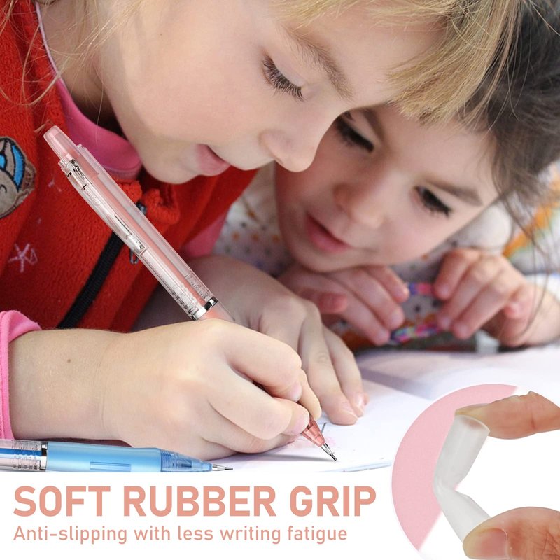Experience a comfortable writing grip with the soft rubber grip that provides anti-slip properties, ideal for school or office use. The transparent pen barrel comes in three stylish colors (pink, blue, and white), adding a refreshing visual touch. Our 360 resin lead refills are crafted from high-quality resin and graphite, ensuring durability and smooth, dark writing – perfect for standardized tests, writing, drawing, and sketching. With a retractable nib for effortless writing, brass mechanism for minimized lead breakage, and ergonomic design featuring a soft rubber grip, this mechanical pencil set is the top choice for students, professionals, artists, and office workers alike. Boost your productivity and efficiency with this essential office tool, elevating your classroom and workplace experience. Choose the Exquisite Bundle mechanical pencil set for reliable and convenient writing.