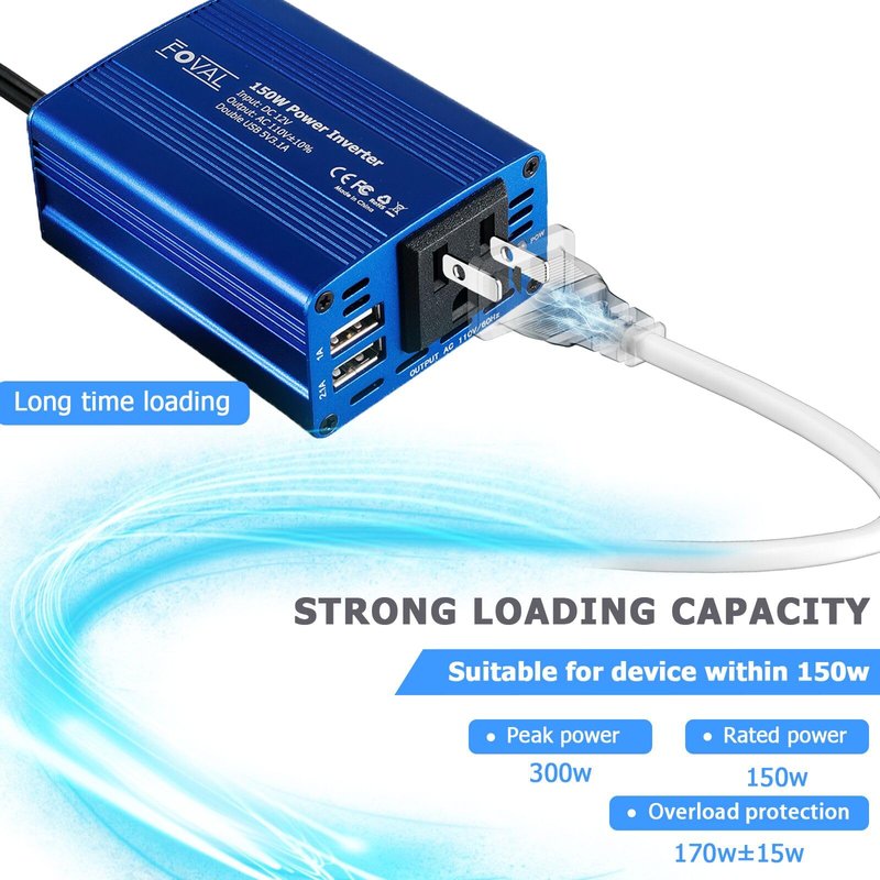 - Premium 150W Car Power Inverter: Offering 150 Watts of continuous 12V DC to 110V AC power, this power inverter for vehicles features an AC plug outlet and 2 USB ports. A great accessories for car road travel charger.