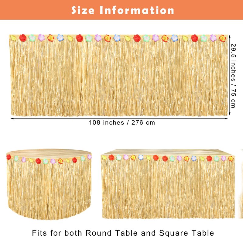 - Proper size: the size of each grass table skirt for luau party is 108 x 29.5 inches / 276 x 75 cm, which can be stuck around tables of different shapes, adding more festive touch to your Hawaiian themed events