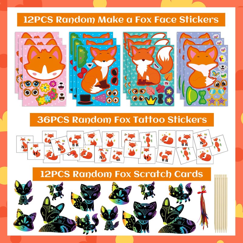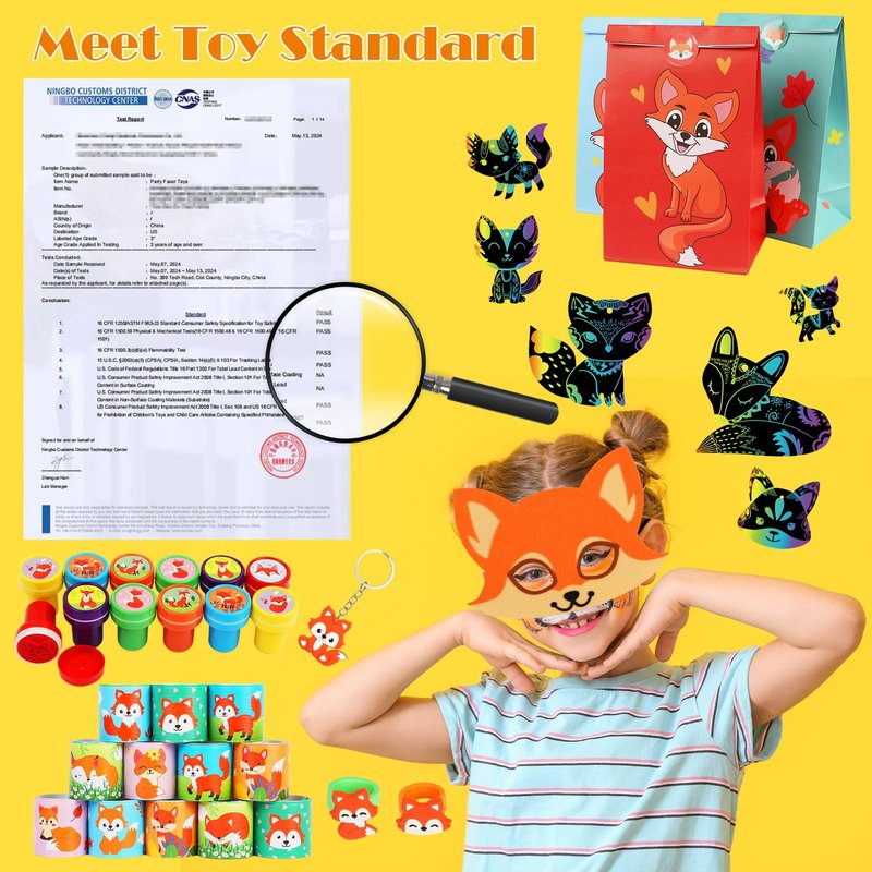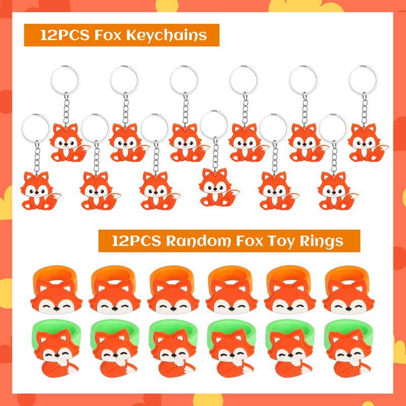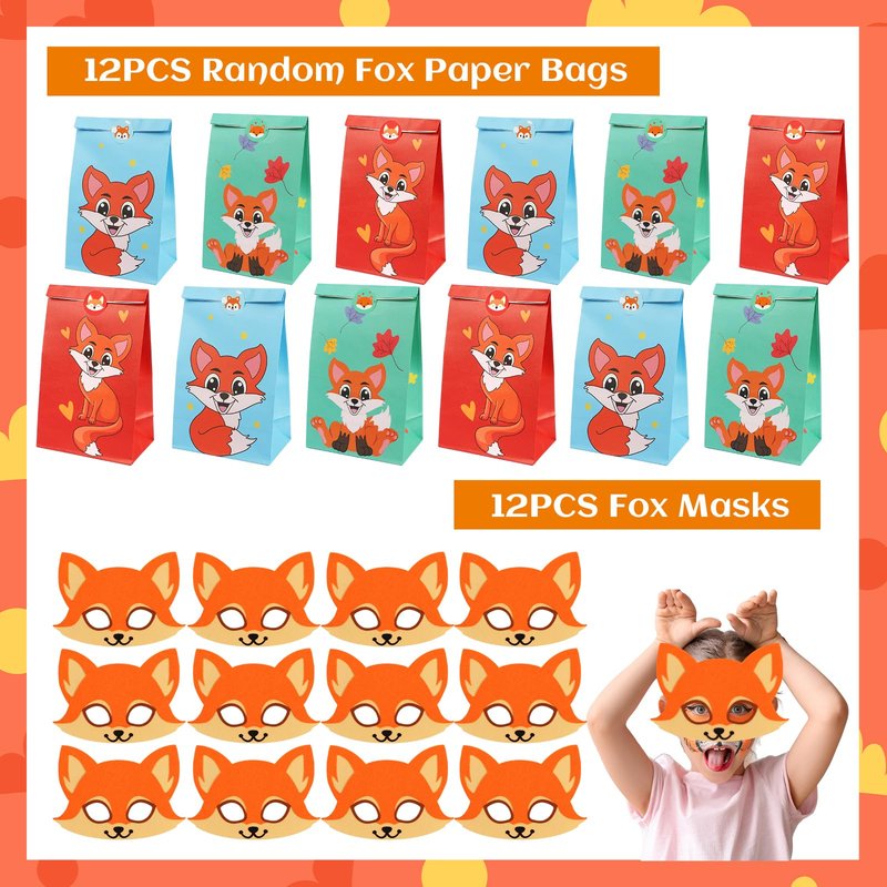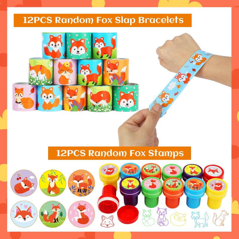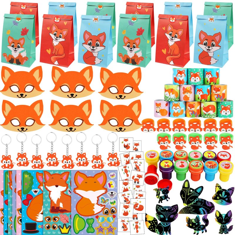 • Large Package on Fox Party Toys. This fox party favors include 12PCS fox gift bags, 12PCS fox masks, 12PCS fox key-chains, 12PCS fox slap bracelets, 12PCS fox ring toys, 12PCS fox stamps, 36PCS fox tattoo stickers, 12PCS Make a fox stickers, 12PCS fox scratch cards.