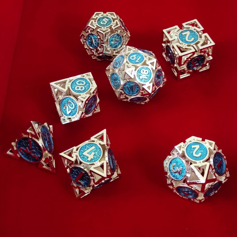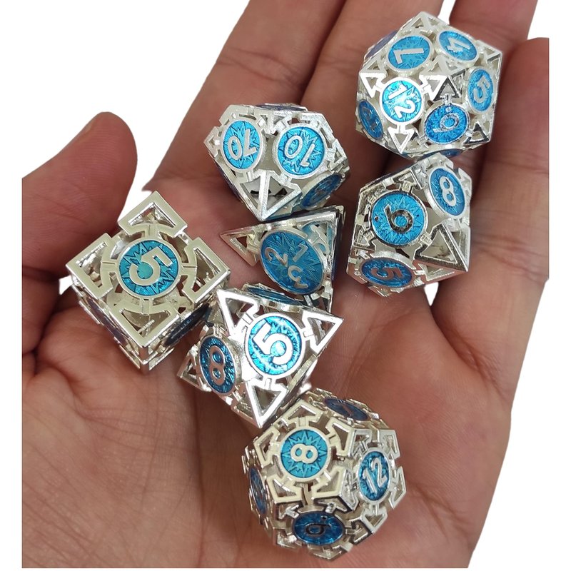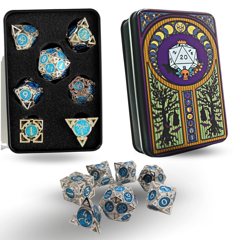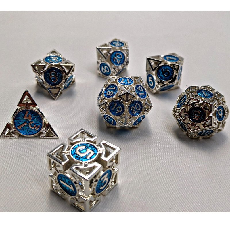 FOXBITE Hollow Metal Polyhedral Dice Set D&D RPG Suitable for Dungeons and Dragons Role Playing Games Blue and Silver