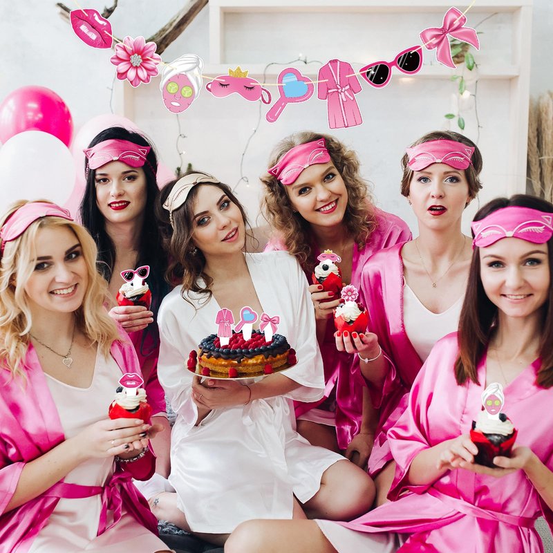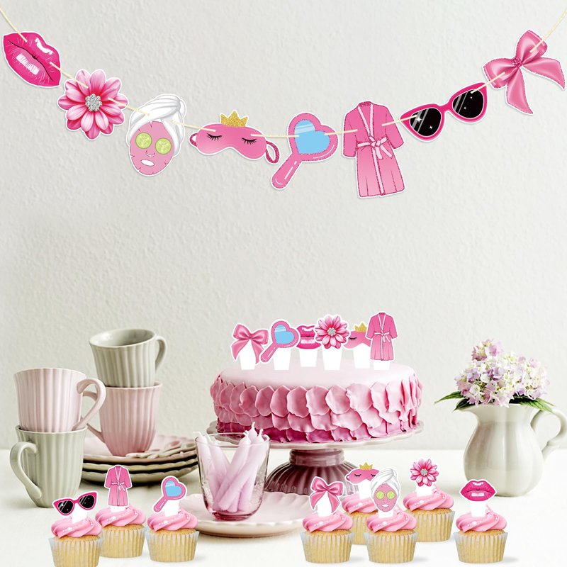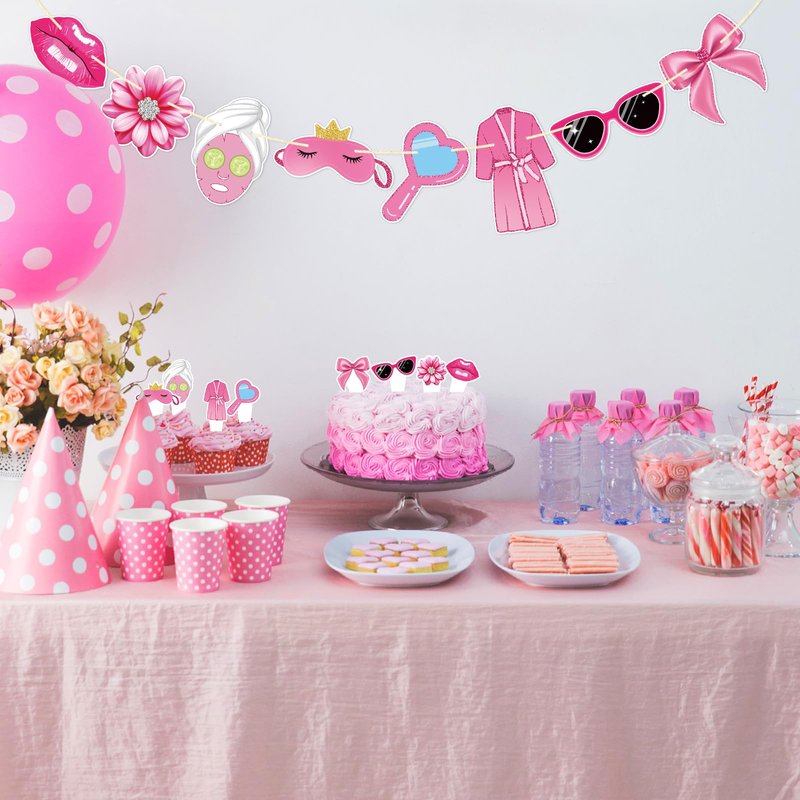 - Slumber party decorations set: Including 1pc of garland and 24pcs cupcake toppers with double-sided printing. Featuring a variety of colorful spa elements, this party set is perfect for creating a relaxing and luxurious atmosphere at your party.