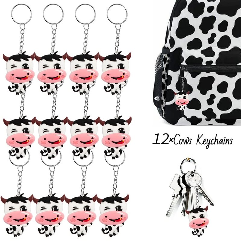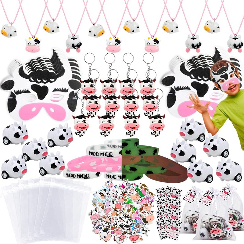 - PACKAGE INCLUDES: 12 cow keychains, 12 cow necklaces, 12 luminous cow bracelets, 12 cute cow animal masks, 12 cow pull back cars, 12 white organza gift bags, 12 cow theme kraft tags, and 50 pieces of cow print stickers