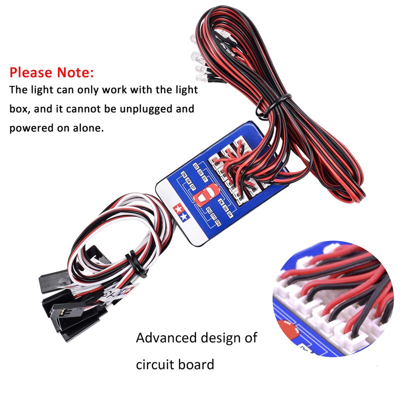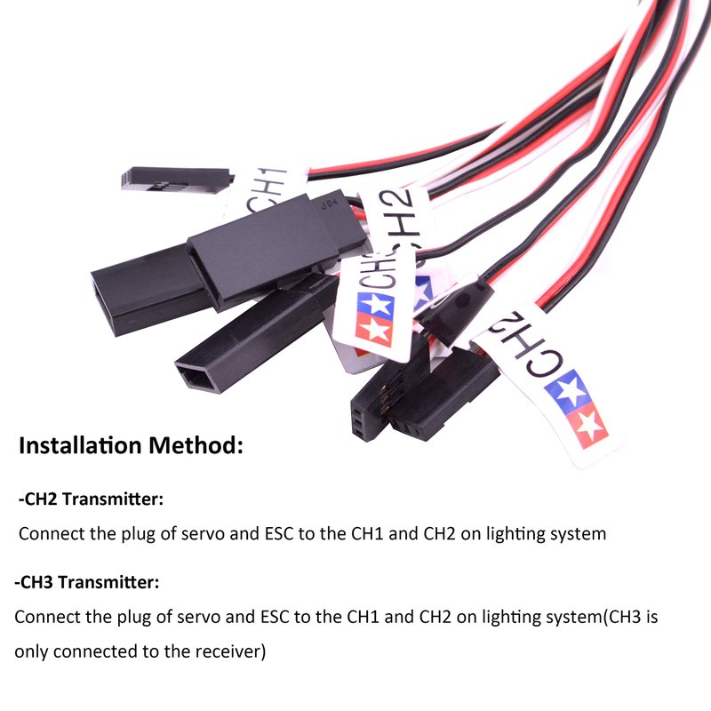 Connect the lighting system to the CH3 on receiver: the transmitter can independently control a group of lights, another group of lights are on when the car speed up;