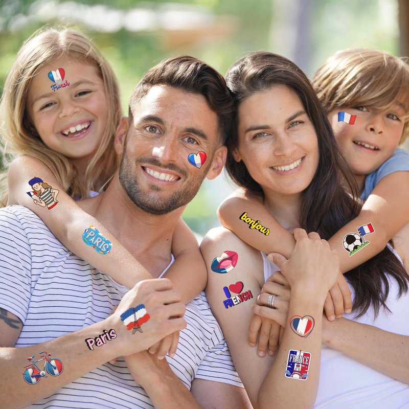 - 6 - Cheer for france - Apply temporary tattoos to your face, neck, arms, or waist to cheer for french sports events. These france theme temporary tattoos are easy to use: simply cut out the desired design, place it on your skin, moisten it with water, and then peel off the backing. When it's time to remove the tattoo, you can easily wipe it off with alcohol or baby oil.