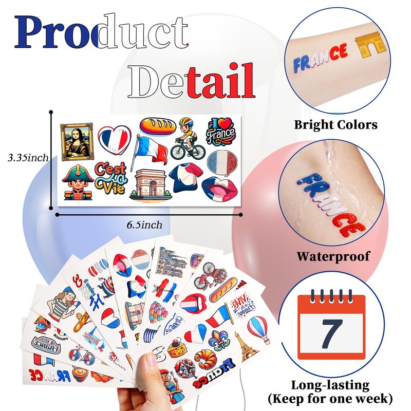 - 5 - Perfect Choice for French Gifts - Our french temporary tattoos stickers are ideal for party prizes or giveaways at french decor party and paris birthday party to the guests, or classroom gifts for children learning french. Whether for party celebrations or everyday surprises, these france themed decorations tattoo stickers bring joy and a delightful experience.