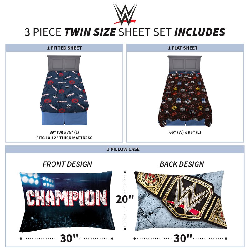 - WORLD WRESTLING ENTERTAINMENT DESIGN: Step into the ring with this cool and colorful WWE Armageddon bedding set. Featuring some of your favorite WWE superstars, this champion sheet set packs a powerful punch. Kids will have a blast body slamming into this cool and colorful set at bedtime.