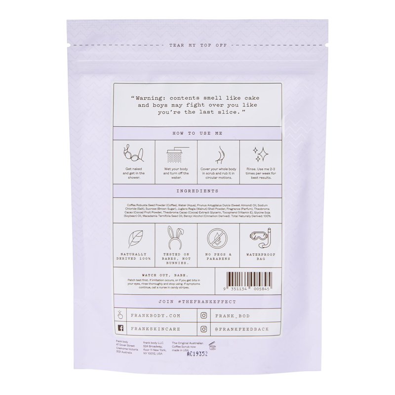 This exclusive pack includes our three best-selling scrubs for soft skin including the Original, Cacao, & Coconut Coffee Scrubs. All of the ingredients in the Frank Body Scrub Variety Pack have been carefully chosen. Robusta coffee grinds provide the ultimate exfoliation for babes who want results. Cold-pressed sweet almond oil is an antioxidant packed oil that leaves your skin hydrated even after rinsing the scrub off. Vitamin E protects your skin from free radicals, promoting healing and fading scars. Get naked and get in the shower. Once your skin is wet, cover your body in the scrub. Scrub in circular motions for a few minutes, from top to toe. Focus on areas that want extra attention by scrubbing them for longer: scars, stretch marks, breakouts or cellulite. Rinse and remember you’re a babe, no matter what. This product is free of parabens, silicones, sulfates, phthalates, PEG, and gluten. It is also vegan as well as cruelty free. Over five years ago in a coffee shop, five friends had a drink and an idea: a humble coffee scrub. Since then, frank body's mission has been to create effective, clean, affordable skincare that makes everyone feel like a babe.